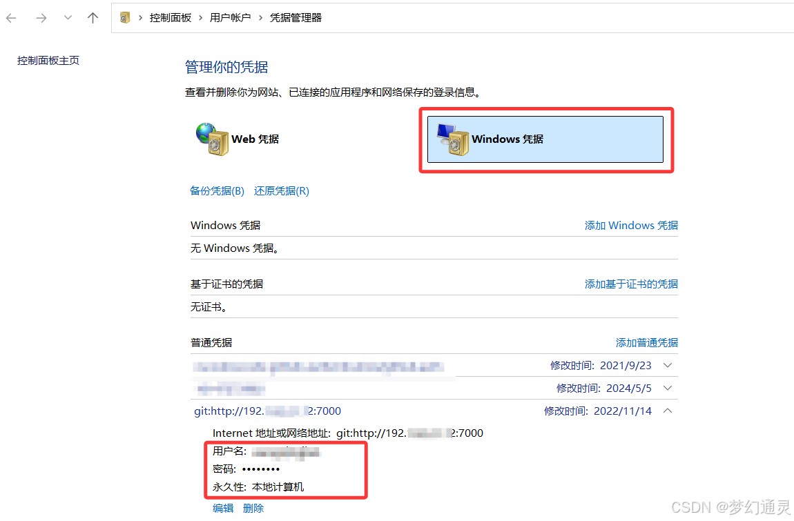 控制面板-【用户凭据】-【windows凭据】,查看对应的git的账户和密码。