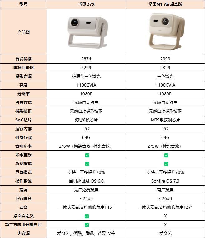在消费级投影市场,激光技术的快速迭代正不断拉低高品质设备的门槛——如今只需两千多元的预算,就能入手一款搭载三色激光技术的投影仪,彻底告别传统led投影的色彩偏色与亮度不足问题。在这一价位段,当贝d7x与坚果n1air超亮版凭借各自突出的产品力,成为多数用户的“二选一”难题。那么这两款有什么区别?谁更值得买呢?下面就一起来看看吧!
