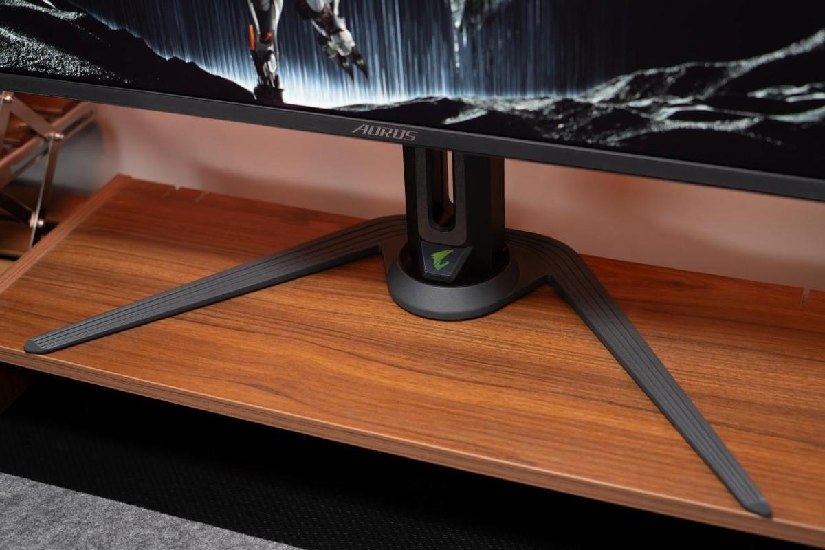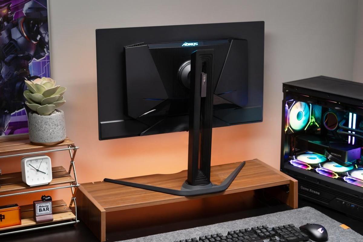 显示器的支架具备人体工学设计,支持屏幕130mm的移动高度调节、-5°~21°的俯仰调节、支持-20°~20°左右水平旋转调节以及90°顺时针屏幕调节。调节时的阻尼感适中且稳定,手感顺滑,玩家可以轻松地调整到最佳观看位置。在支架中间还预留有理线孔,电源线、视频线可以通过其进行整理,让电脑桌面更为整洁。aorus fo27q5p为y字形金属底座,在确保屏幕放置稳定的同时也减少了对桌面空间的占用。