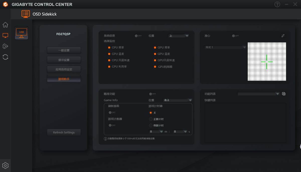 除了超高规格带来的极致流畅画面之外,作为一款高端电竞显示器,aorus fo27q5p也少不了丰富专业战术功能的加持,包括分辨率切换、黑平衡2、狙击镜、闪光模式、夜视模式等,进一步提升游戏操作体验。只要按下osd摇杆,然后向右拨动就能打开界面进行开启。或者玩家也可以用自带的数据线连接主机和显示器上的usb type-b上行接口相连,这样就可以用gcc软件直接对显示器的运行状态进行监控,对各种参数、功能进行调节,操作起来更加方便。