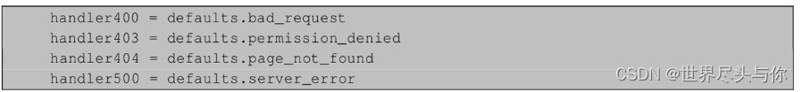最后,还需要指定错误处理handler的入口。这需要在项目的urls.py文件中指定,而不是在应用的urls.py文件中指定: