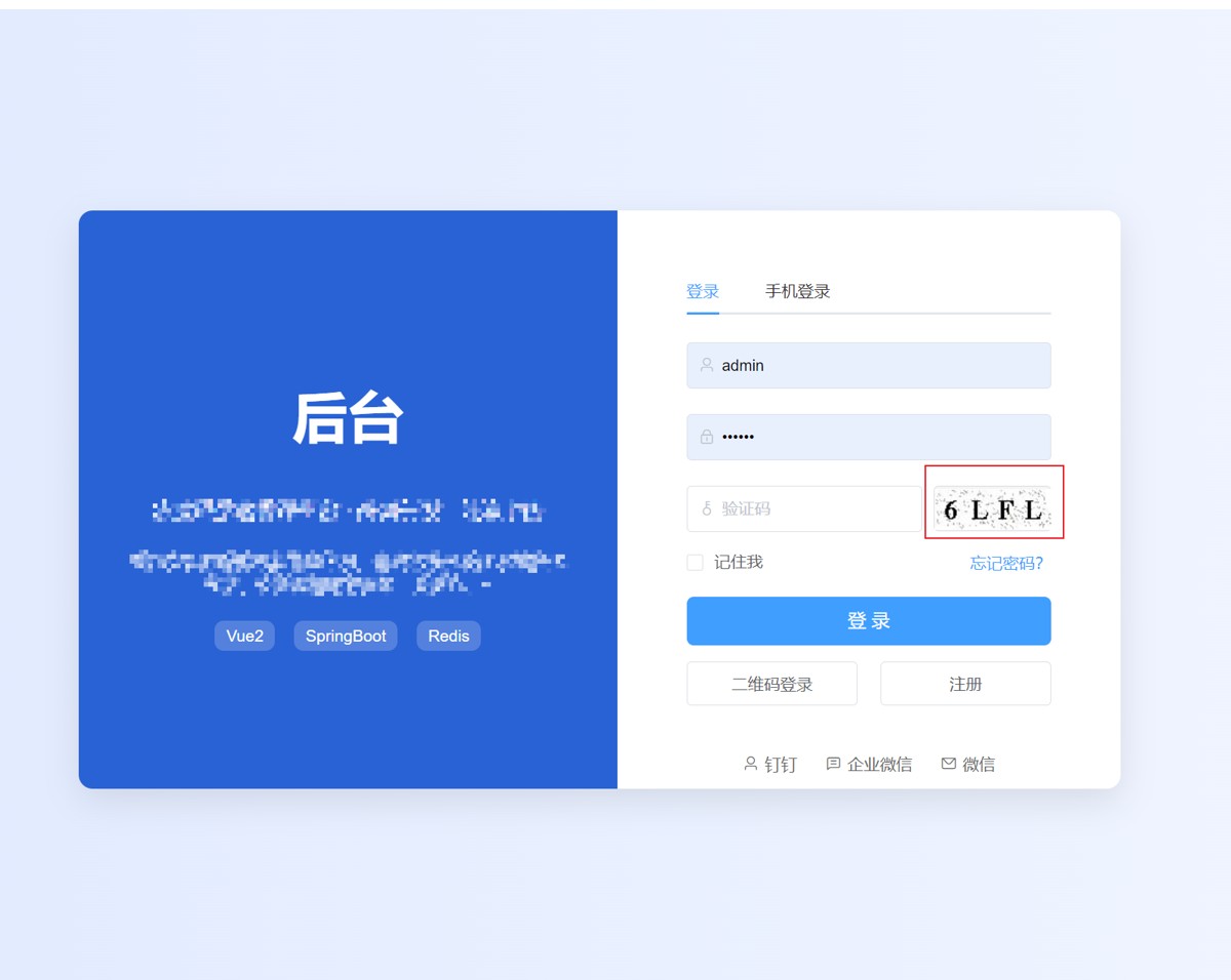 这里的图片二维码是后端接口返回的base64(图片转base64),然后渲染到页面部分。用户点击这个图片可以生成新的验证码。验证码的有效时长是1分钟、超过有效期 ,验证失效。(有效时长可以通过改变验证码存入redis的时长来调整)。