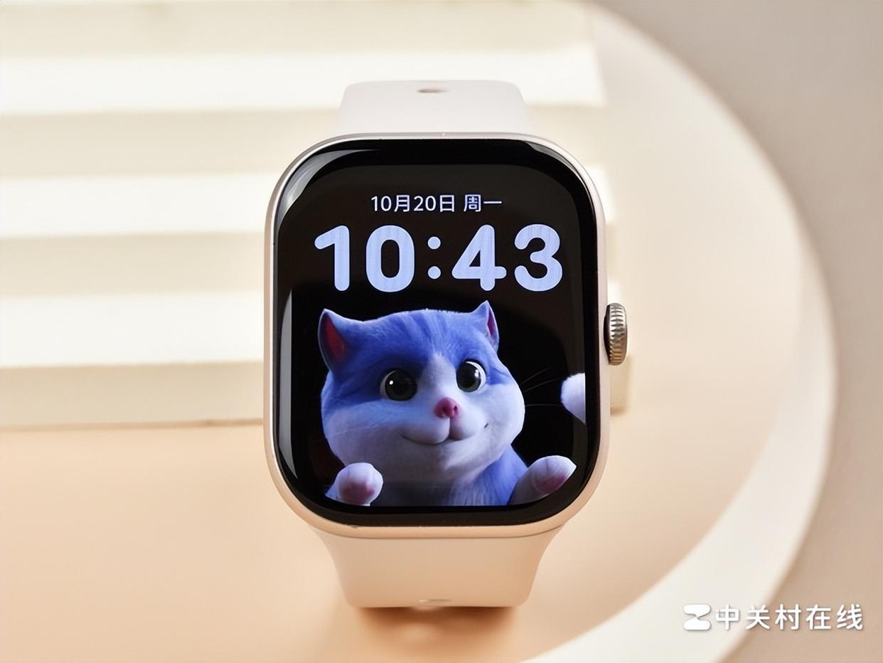 采用方形表盘设计,右侧居中有一颗旋转表冠,正面是2.07英寸超亮全景屏,屏占比达82.4%,峰值亮度2400尼特,相比前代1.85英寸屏幕,视野提升显著。