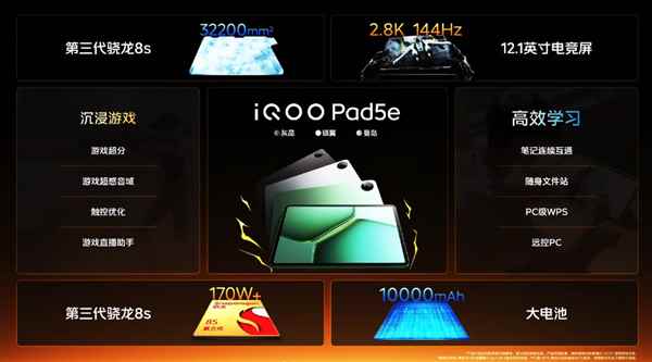 iqoo pad5e,主打超轻薄性能强,搭载了第三代骁龙8s处理器以及立体散热系统,iqoo pad5e 12.1英寸屏幕搭配2.8k高清分辨率,画面细节呈现堪称细腻,144hz高刷新率则带来流畅的操作体验,续航上配备了10000毫安时大电池,用一天也不担心没电。话不多说,一起欣赏iqoo pad5e的美图吧
