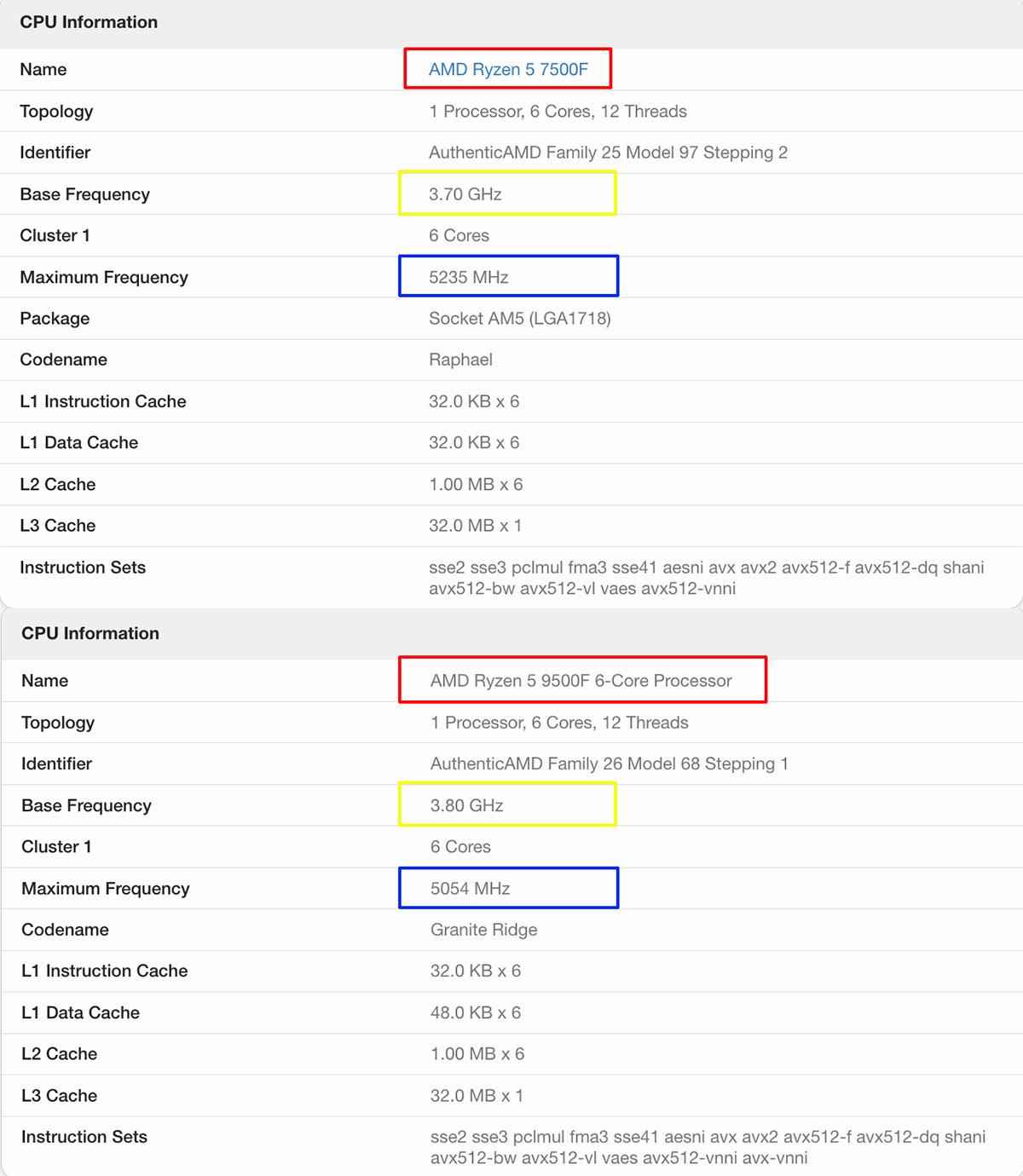 从规格来看,amd ryzen5 9500f和ryzen5 7500f 基本上非常相似,最明显的区别在于架构升级,ryzen5 9500f采用了zen 5架构,而ryzen5 7500f则是基于上一代的zen 4架构。除此之外,两款处理器的核心数、线程数、频率(主频提升了100mhz)、缓存、功耗 等几乎一致。即便如此,厂商仍然对9500f进行了“架构更新”,声称能带来更高的单核和多核性能。