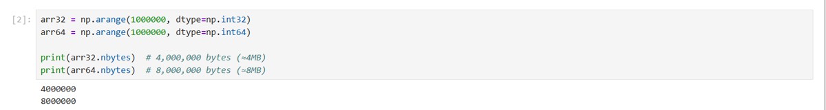 arr32 = np.arange(1000000, dtype=np.int32) arr64 = np.arange(1000000, dtype=np.int64) print(arr32.nbytes) # 4,000,000 bytes (≈4mb) print(arr64.nbytes) # 8,000,000 bytes (≈8mb)