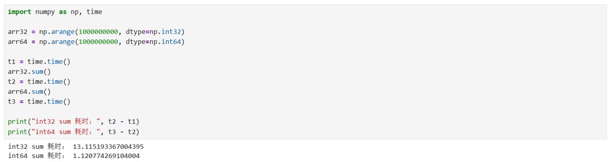 int32 sum 耗时: 13.115193367004395 int64 sum 耗时: 1.120774269104004