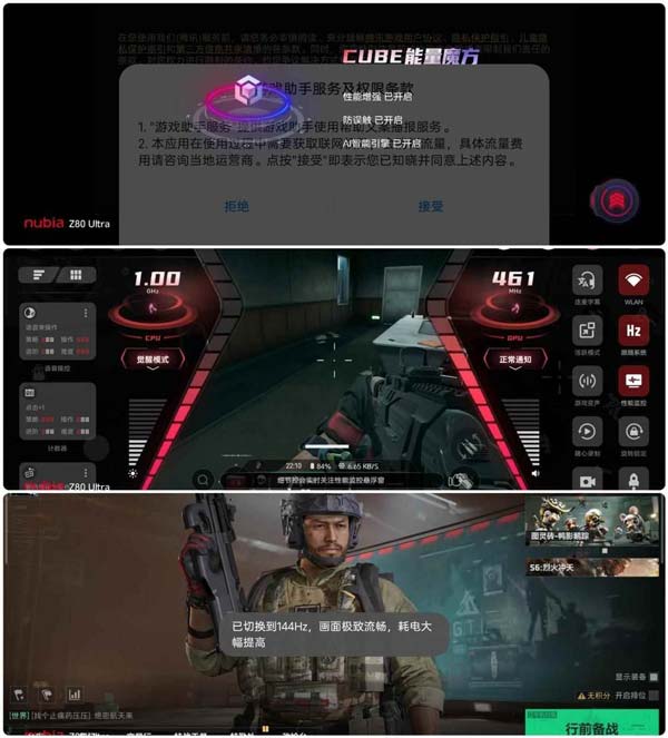 跑分就不用多说了,直接来看一下努比亚z80 ultra的游戏实测表现。从进入游戏开始,红魔专业游戏手机同款游戏引擎缓缓展开,别被这复杂炫酷的游戏助手界面给吓到了,大部分情况下你只需要开启觉醒模式,就能快速优化帧率、温度、功耗,确保游戏过程中的稳定的帧率输出,同时有效控制机身温度。
