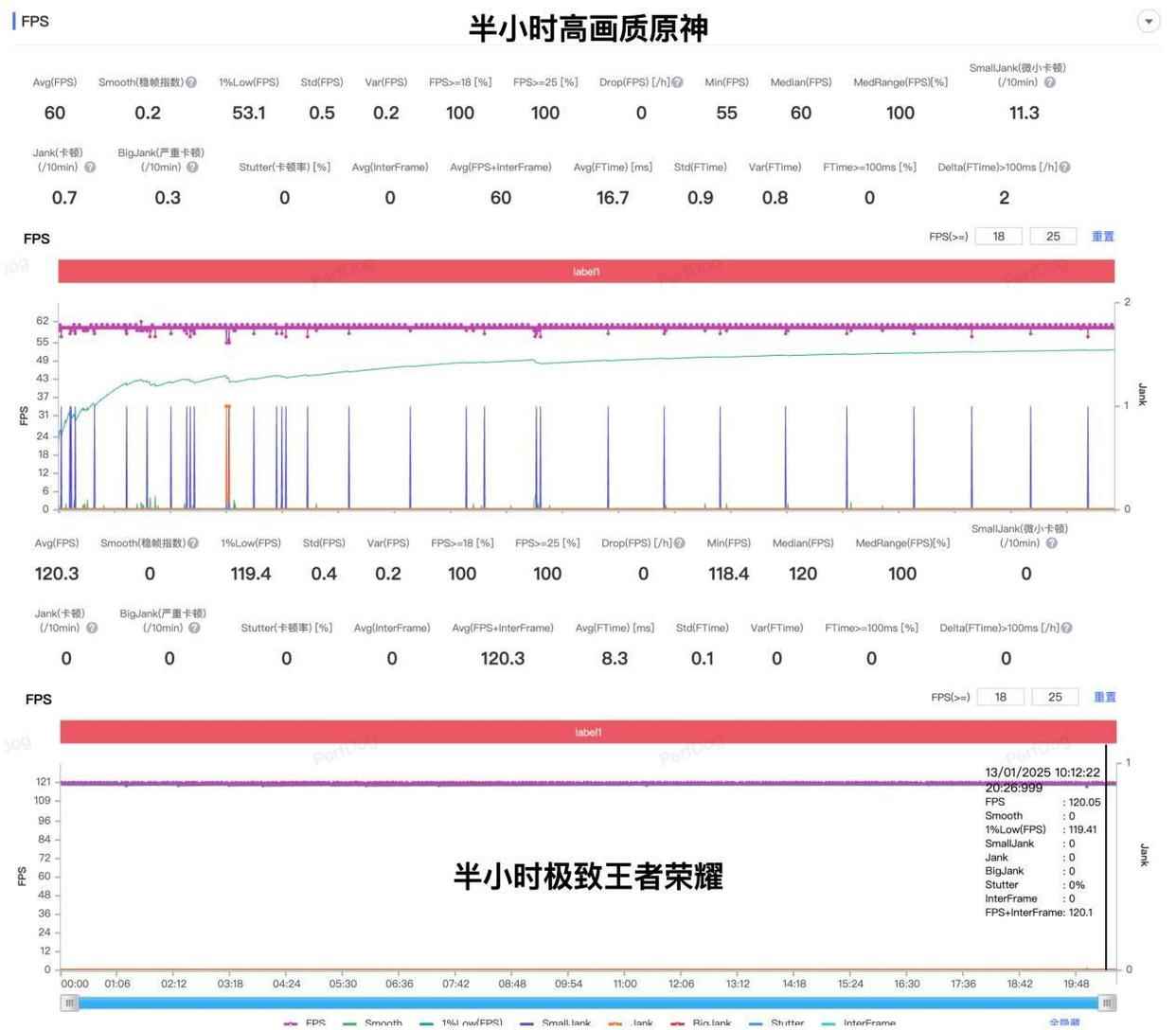 实测在觉醒模式下,半小时最高画质《原神》须弥跑图,努比亚z80 ultra平均帧率可以达到60fps满帧运行,稳帧指数也达到了0.2,几乎全程没有帧率波动。至于《王者荣耀》这种国民级手游,更是120fps无压力。