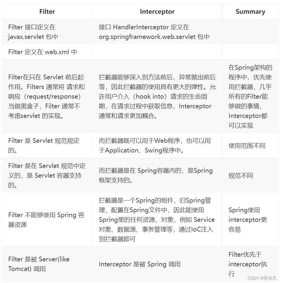 拦截器(interceptor)是基于 java 的反射机制,而过滤器(filter)是基于函数回调。从灵活性上说拦截器功能更强大些,filter 能做的事情,拦截器都能做,而且可以在请求前、请求后执行,比较灵活。filter 主要是针对 url 地址做一个编码的事情、过滤掉没用的参数、安全校验(比如登录不登录之类),太细的话,还是建议用拦截器。