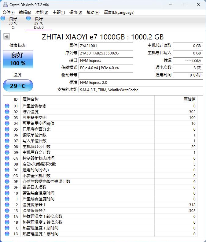 致态小翼e7 1tb使用pcie 4.0 x4接口,支持nvme 2.0协议。过去致态ssd的固件版本以及序列号都是以zt(致态的拼音首字母)开头,而致态小翼e7则是以zy开头,y代表了(小)翼。