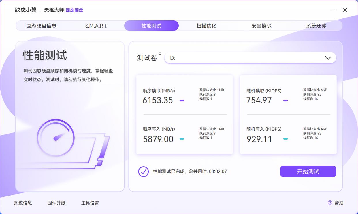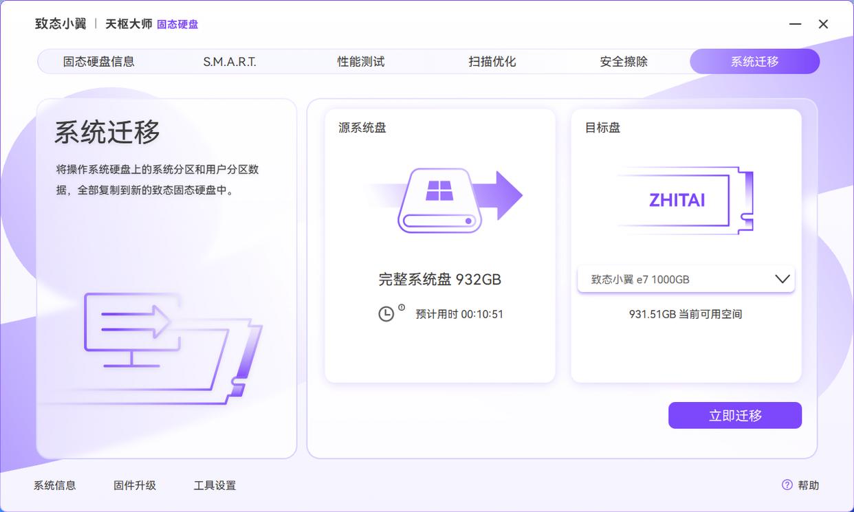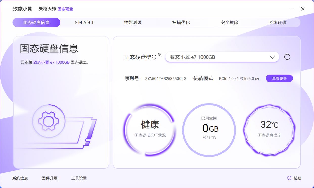 除了原有的smart健康信息和安全擦除等功能之外,新版天枢大师增加了清新配色的致态小翼皮肤,并新增性能测试、扫描优化和系统迁移功能。