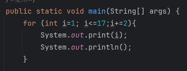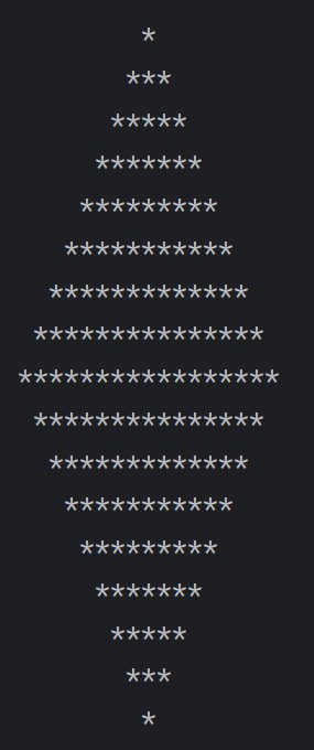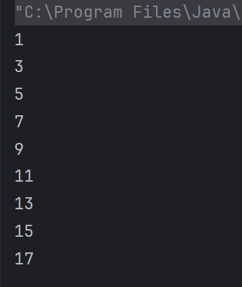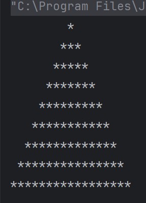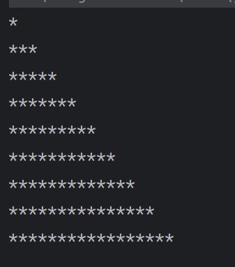 我们可以将这个图形差分来看,只看上半部分(前9行)是一个等腰三角形,我们会发现它每一行都比上一行多两个“*”,我们可以选择先将这部分输出出来,也就是一个简单的输出1-17中所有单数的循环,这里注意,我们要把输出数字和换行分开写,这是为了便于我们下面在以上基础上更改代码,代码及结果如下