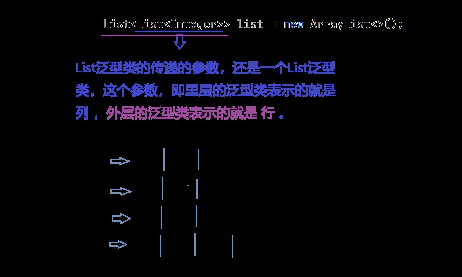 示例:可以往这个列表中添加元素,只不过这个元素是一个个实例化的对象(传递的参数是一个泛型类,那么它也需要明确传递的参数类型,因此需要实例化对象),证明是一个二维数组: