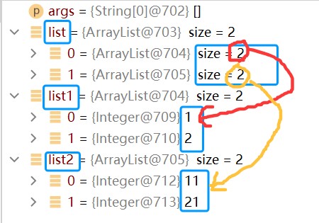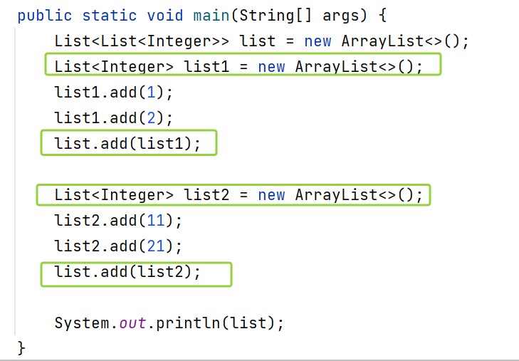 那么我们可以单独将列表每个实例化的元素写出来,往这一个个元素中,使用add方法添加元素,然后再将这些实例化的对象的引用传递给列表: