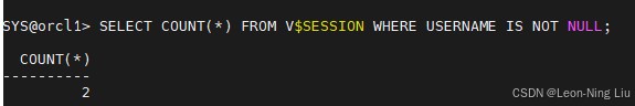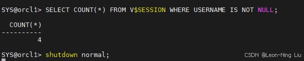 ```sql select count(*) from v$session where username is not null; ``` 结果返回`2`,说明会话 1(关闭操作)和会话 2(普通用户)均处于连接状态: