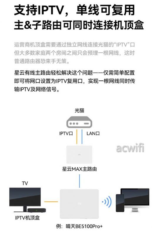 中兴星云max主路由支持iptv功能,可以解决客厅只有一根网线,但又需要同时传输有线mesh和iptv盒子信号的问题。