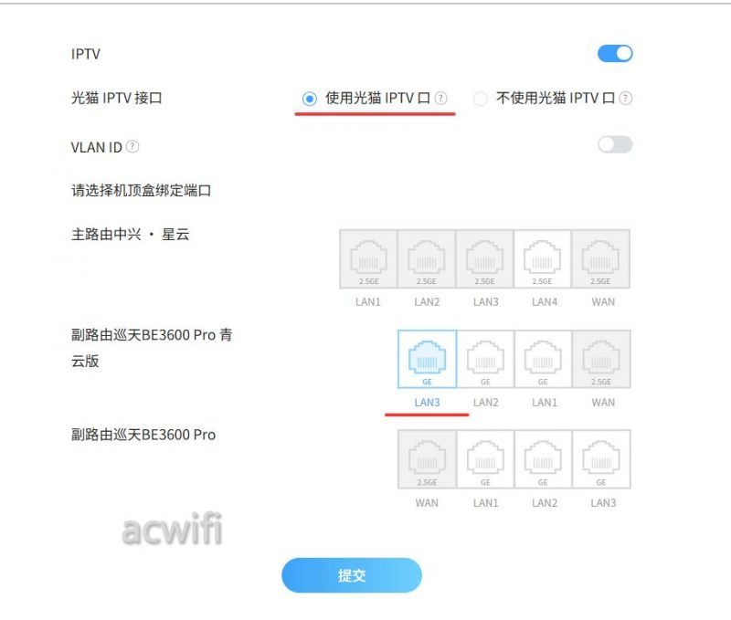 我家的联通iptv,只能连接固定的那个itv口,所以要开启iptv功能,选择“使用光猫iptv口”,把中兴星云max主路由的lan1(开启iptv后默认用lan1口)与光猫的itv口用网线相连。不需要设置 “ vlani d”,然后选择那台用来连接电视机顶盒的子路由,选择一个用来连接电视盒子的网口,提交。最后用网线把电视盒子的网口与子路由选定的网口连接。