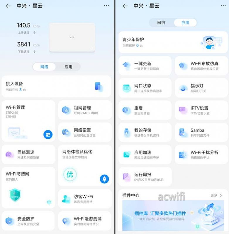安装“中兴智慧生活”app,绑定路由器就可以本地和远程管理路由器。app两大界面菜单:网络和应用。