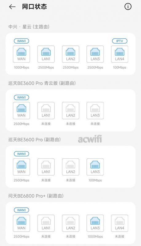 网口状态可以查看所有路由器的网口工作状态,包括是否激活端口和显示端口当前的连接速率,一目了然。