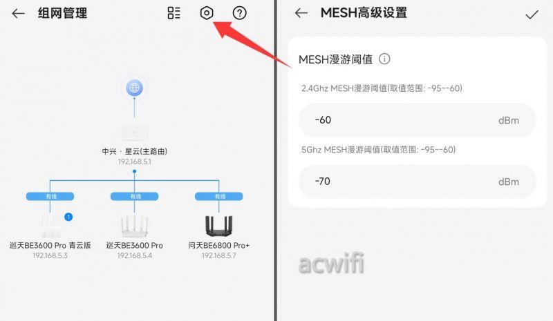 组网管理里面可以方便查看各子路由的信息,也可以设置漫游阈值