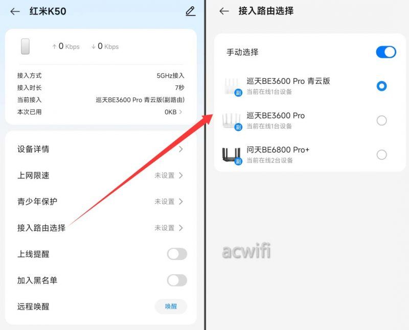 在接入设备里面,可以对连接设备进行“接入路由绑定”,对于智能家居设备来说,绑定到最近的那台无线子路由,是很实用的功能,避免连接到较远的那台弱信号。