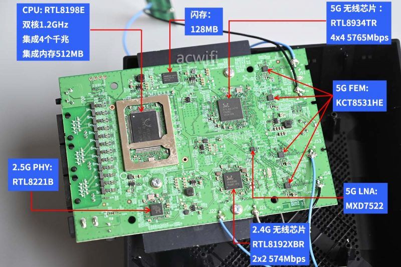5g无芯片是rtl8934tr,支持802.11be,无线基带方面支持4x4mimo,在160mhz频宽和4096-qam下最高无线速率为5765mbps;射频方面支持4t5r,由于内存容量的限制,无线带机量最高256台。