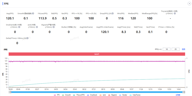 极致画质120帧的5v5回放中,平均帧数达到120.1帧,稳帧指数0.1,1%low帧113.9fps。
