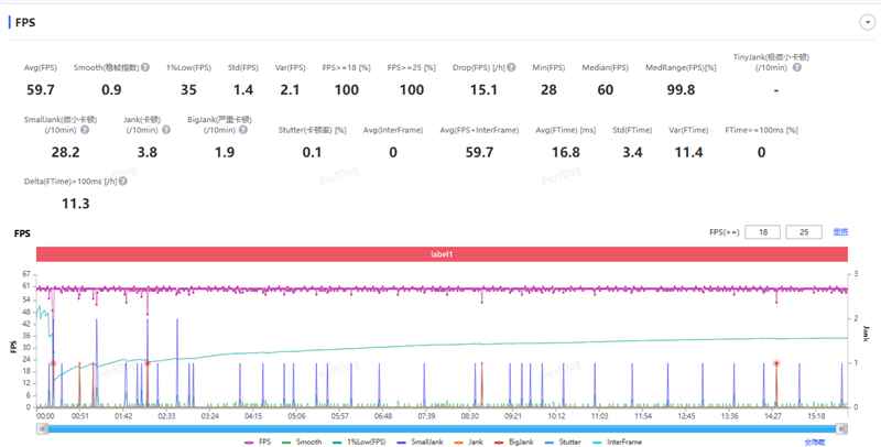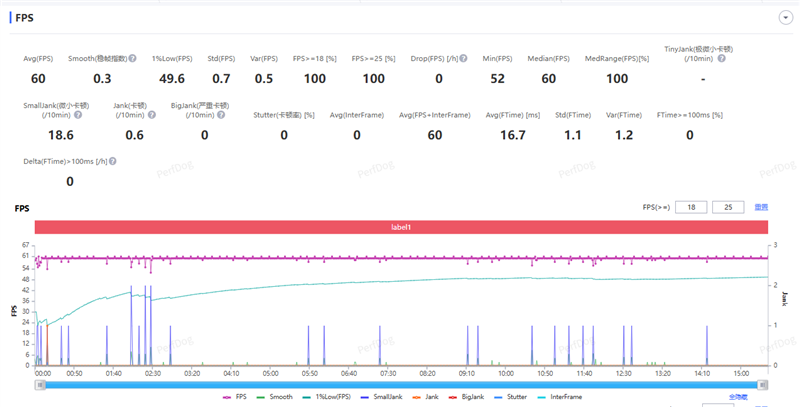 最高画质60帧,关闭动态模糊跑图,15分钟平均帧数60fps轻松跑满,稳帧指数0.3,1%low帧49.6fps。