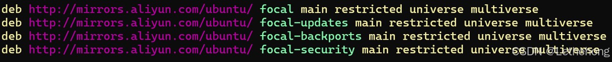 deb http://mirrors.aliyun.com/ubuntu/ focal main restricted universe multiverse deb http://mirrors.aliyun.com/ubuntu/ focal-updates main restricted universe multiverse deb http://mirrors.aliyun.com/ubuntu/ focal-backports main restricted universe multiverse deb http://mirrors.aliyun.com/ubuntu/ focal-security main restricted universe multiverse