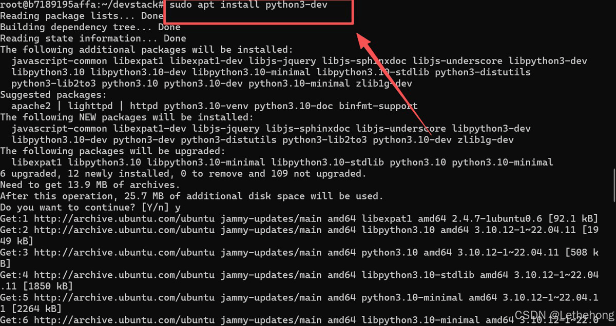 在 ubuntu 24.04 中,python-dev 已经被替换为 python3-dev。如果遇到类似错误,可以通过以下命令安装 python3-dev: