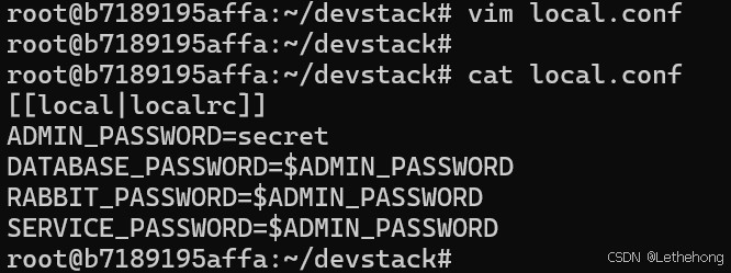 devstack 的配置文件 local.conf 是安装和配置过程中的关键文件。在该文件中,你需要指定管理员密码以及一些服务的配置。创建并编辑 local.conf 文件: