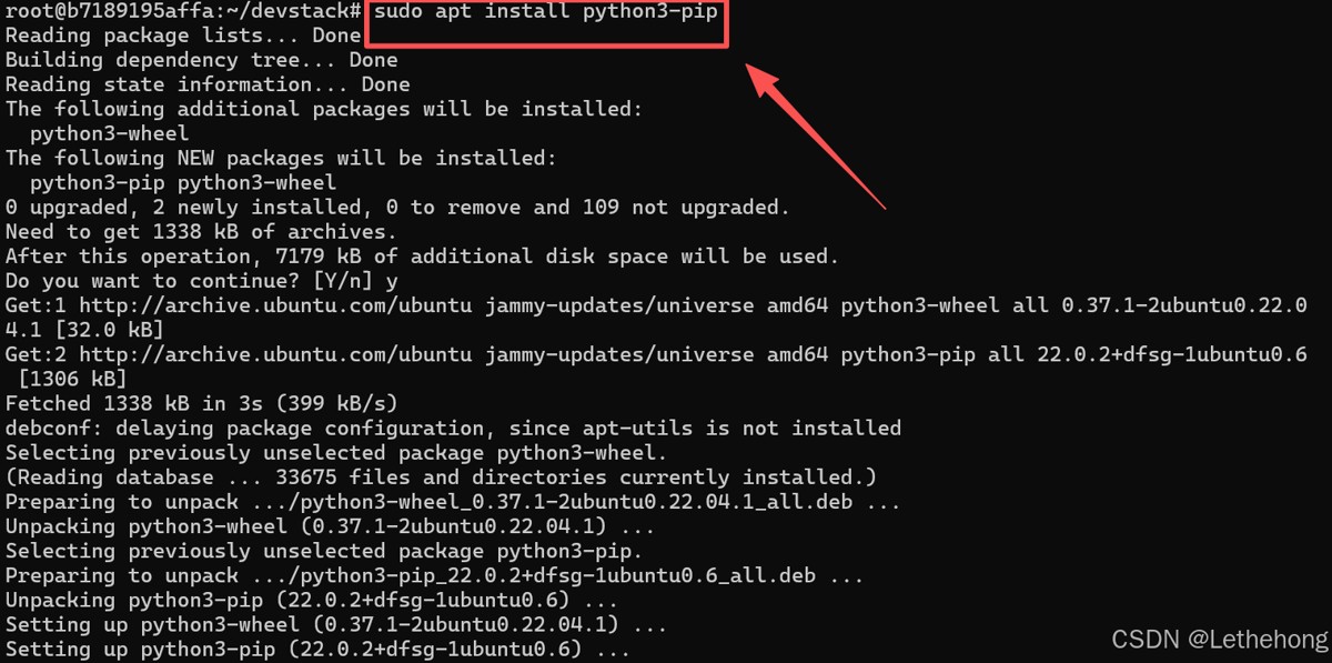 这些工具和库对安装 devstack 和 openstack 都是必需的。特别是 python3-dev 和 python3-pip,它们是 python 相关的开发工具,可以确保你能够顺利运行 devstack 脚本。