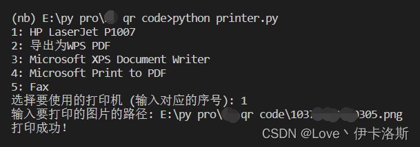 python printer.py 运行后,会检索本机已经连接的打印机设备,然后通过需要选择打印机,然后传入图片路径即可下发打印任务到打印机(期间会对图片转矢量图)。