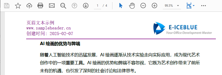 在 pdf 页面上添加页眉不仅能让文档更具专业感,还能提高阅读与管理的效率。比如在页眉中加入公司 logo、报告标题或页码,读者就能轻松识别文件来源并快速定位内容。使用 spire.pdf 提供的 pdfcanvas,你可以灵活地将文字、图片或日期等信息绘制到指定位置,通过坐标精确控制布局与样式。相比手动逐页添加,程序化生成页眉不仅节省时间,还能保持版式一致。下面我们将介绍具体的实现步骤,并附上完整的代码示例。