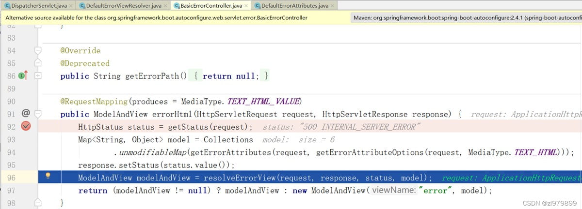 - 底层就会发送 /error 请求,会被basicerrorcontroller处理