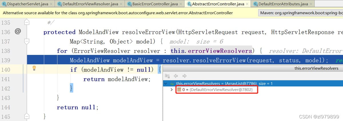 - 然后交由handlerexceptionresolvercomposite,遍历其中的异常处理器处理,但此例子默认无法处理