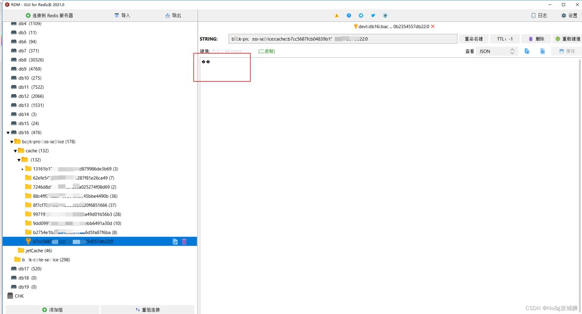 springboot 集成 redis,使用 @cacheable 注解之后,把数据缓存到 redis 中,数据是保存在redis 中了,但是,通过 redis 的可视化管理工具查看缓存的数据时,却发现 redis 中的 key 正常,但是 value 是乱码。如下图所示的乱码: