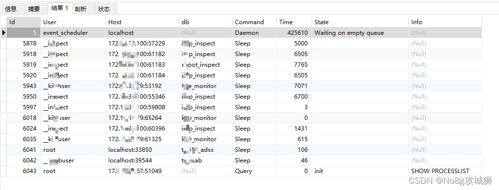 注意: show processlist只显示前100条 我们可以通过show full processlist 显示全部。
