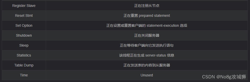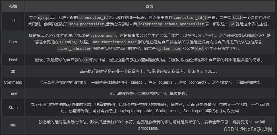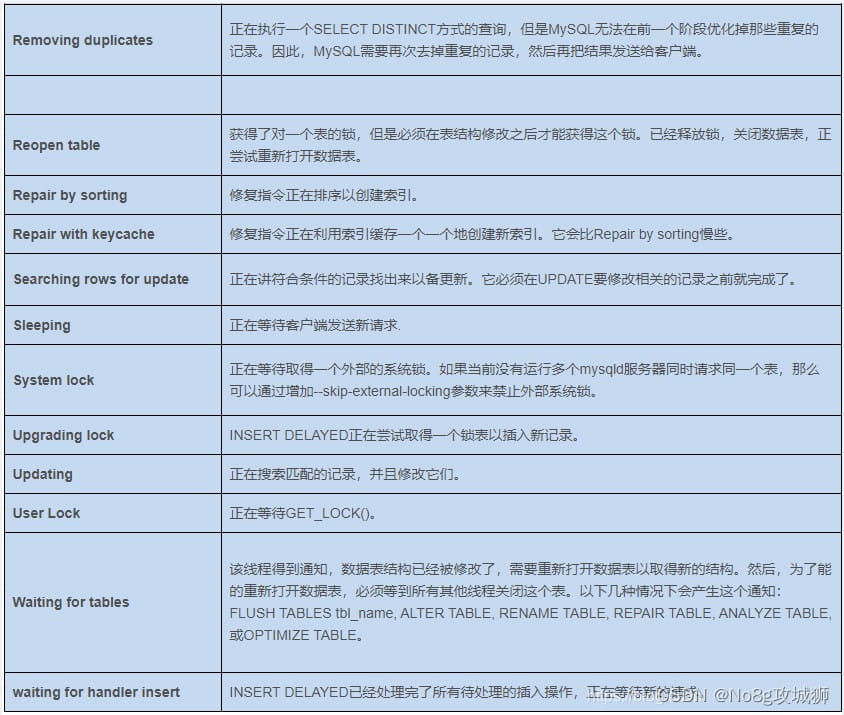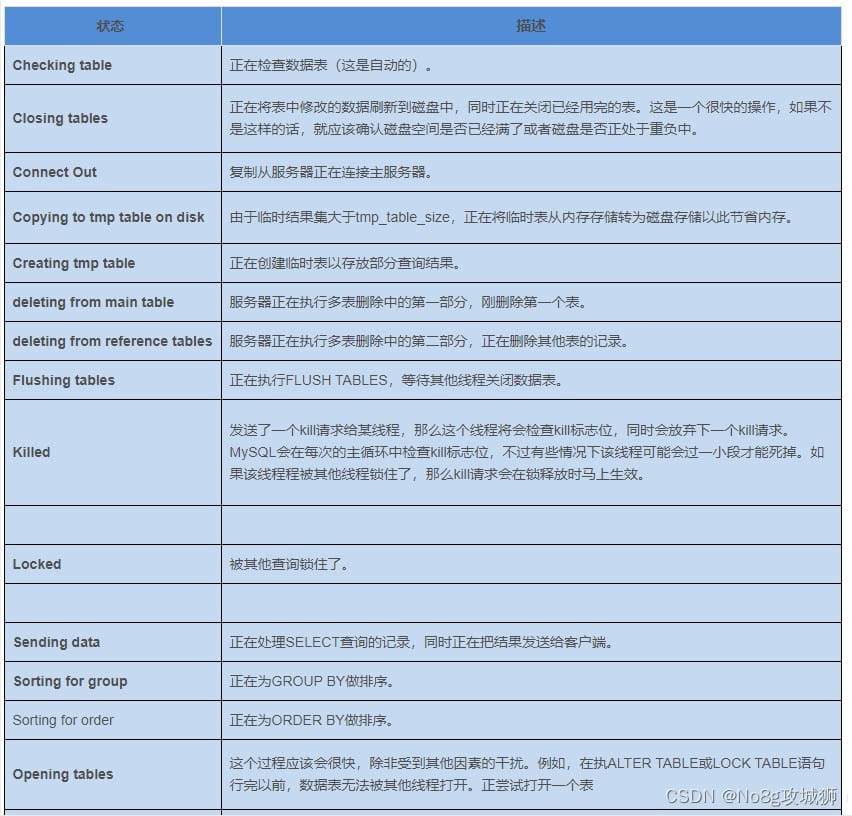 对于一个mysql连接,或者说一个线程,任何时刻都有一个状态,该状态表示了mysql当前正在做什么。show processlist 命令的含义便是显示哪些线程正在运行。