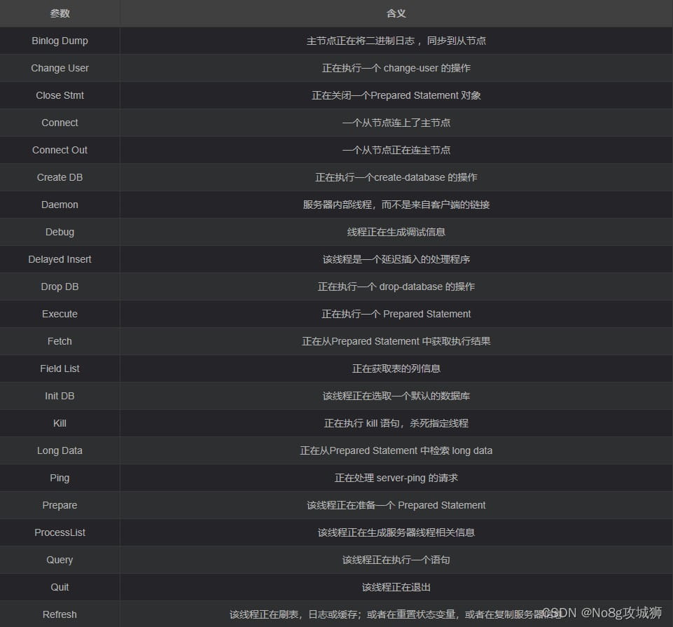 | command | 当前执行的命令类型,如 query(查询)、sleep(休眠)等 |