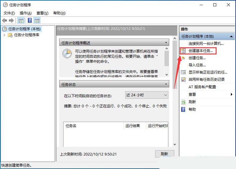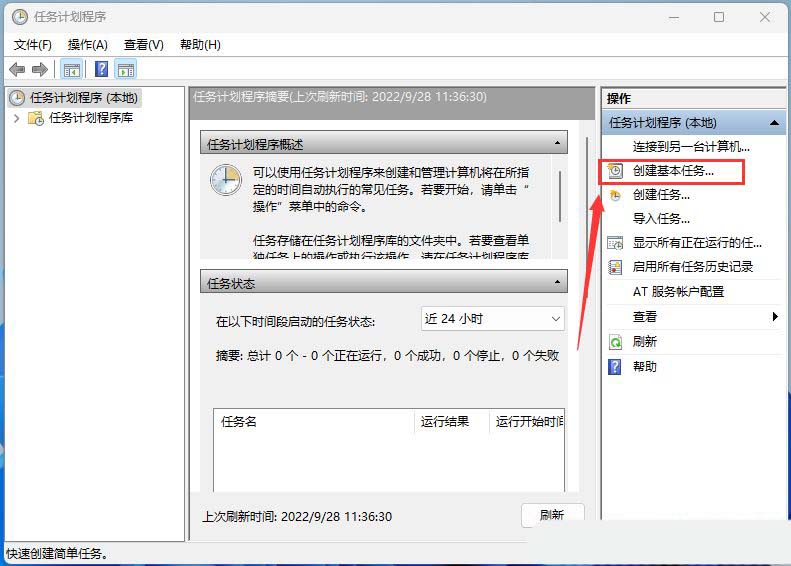 2、任务计划程序窗口,右侧操作下,点击【创建基本任务...】;