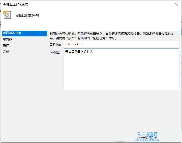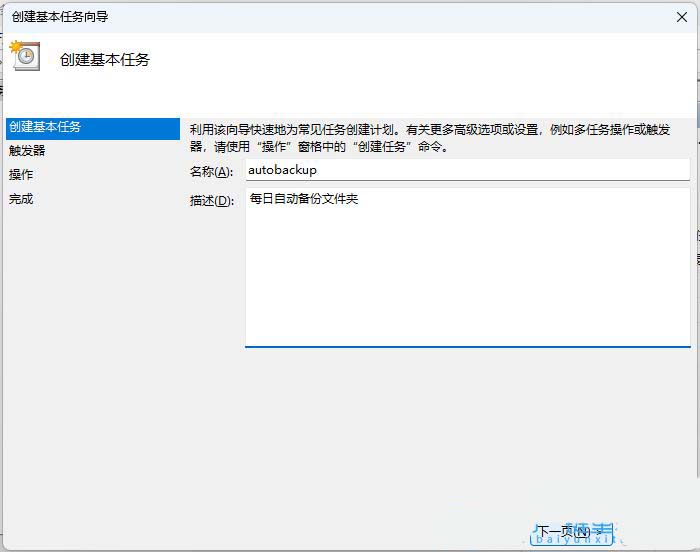 3、创建基本任务向导窗口,名称输入【autobackup】,描述为【每日自动备份文件夹】,再点击【下一页】;