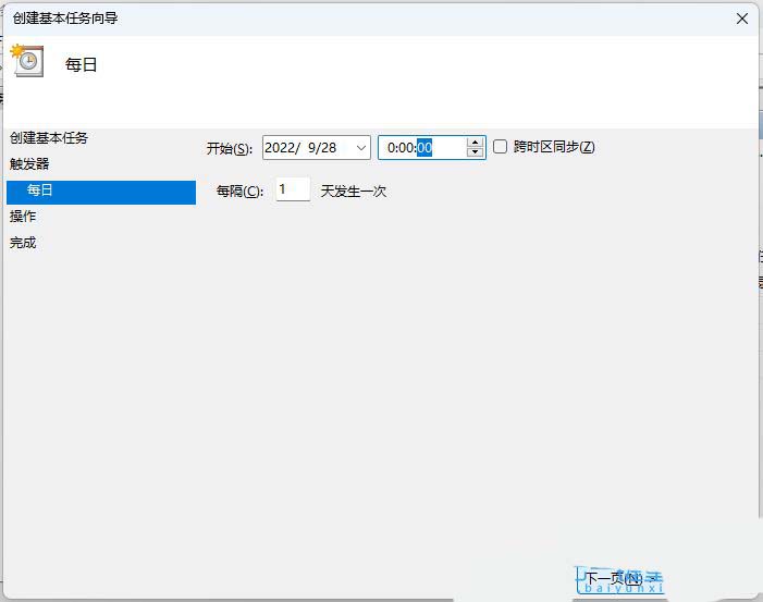 5、设置任务运行的时间,修改为每日的零点自动备份,再点击【下一页】;