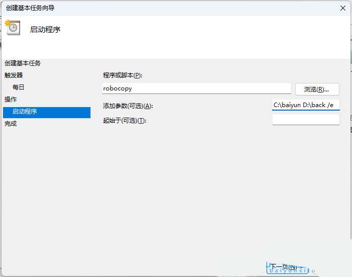 7、程序或脚本栏输入【robocopy】,添加参数栏输入【c:aiyun d:ack /e】,意思就是通过robocopy命令,将c盘baiyun文件夹备份到d盘back文件夹下,/e的参数是表示复制所有文件夹,包含空文件夹。再点击【下一页】;