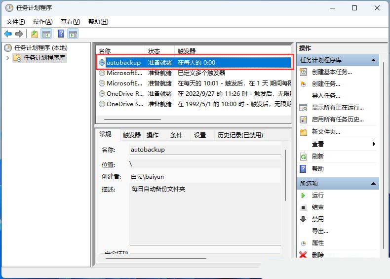 9、任务计划程序库中,就可以看到刚创建的任务,这样系统就会在每天凌晨自动执行我们设定的备份任务;