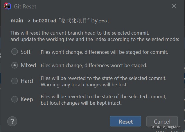 有时候我们需要直接将本地的代码回滚到版本库的某一个版本,这时候可以使用reset来进行回滚。reset有几种模式: