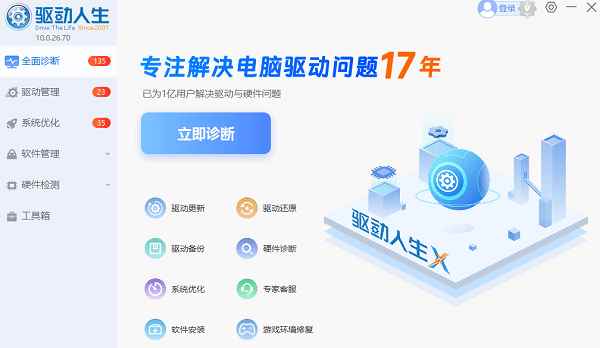 1、点击上方下载按钮安装打开“驱动人生”点击【全面诊断】选择下方的“立即诊断”选项;