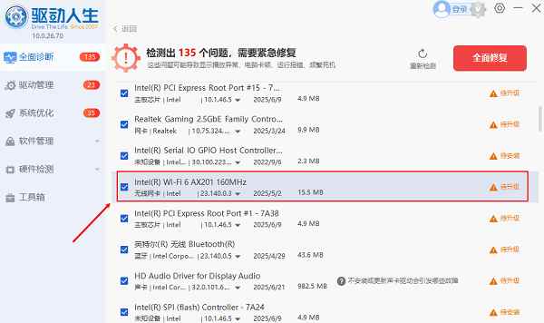 2、软件会全盘扫描电脑存在的问题,用户可以选择无线网卡驱动进行更新,也可以选择“全面修复”一键修复电脑的所有问题。