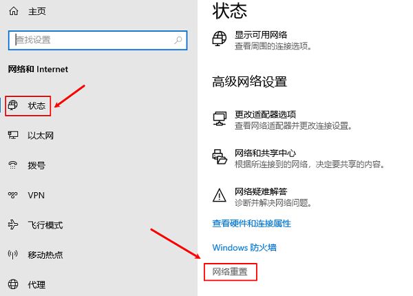 2、进入“状态”选项卡,向下滚动找到“网络重置”;